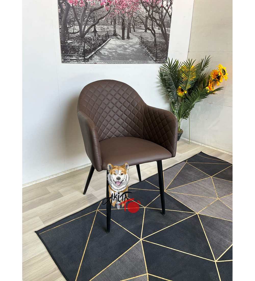 Materialidad: La estructura del asiento y su respaldo son de madera terciada, con espuma de alta densidad que le da un acolchado fantástico. El tapiz es de Eco-Cuero y sus patas son metálicas electropintadas en color Negro. Dimensiones (cms.): Alto Respaldo: 82 Alto Asiento: 45 Alto Brazos: 62 Ancho: 58 Profundidad: 62